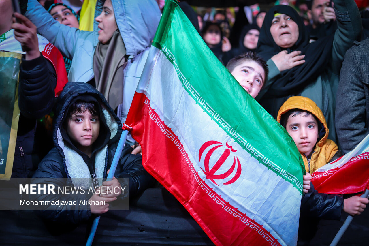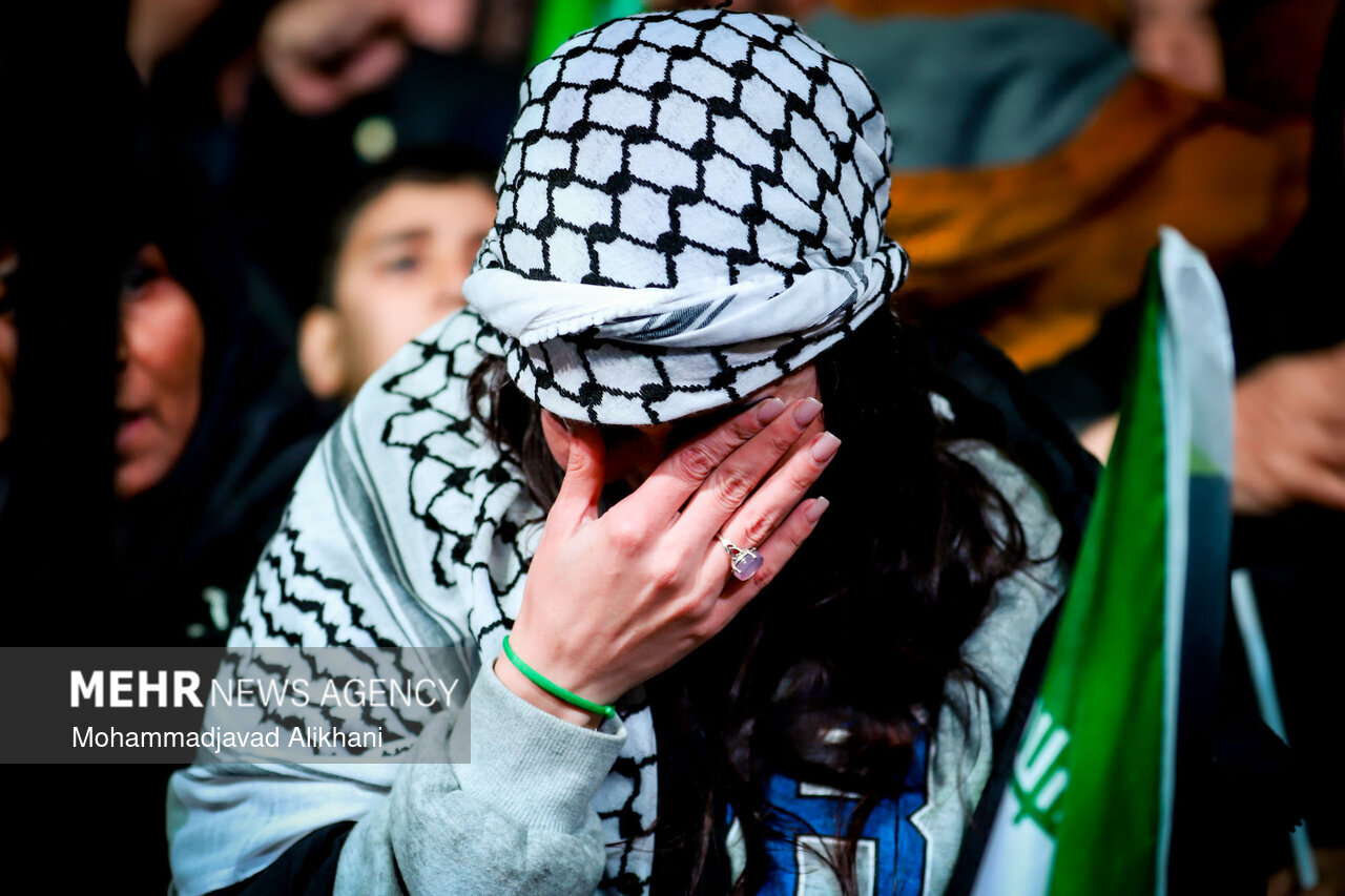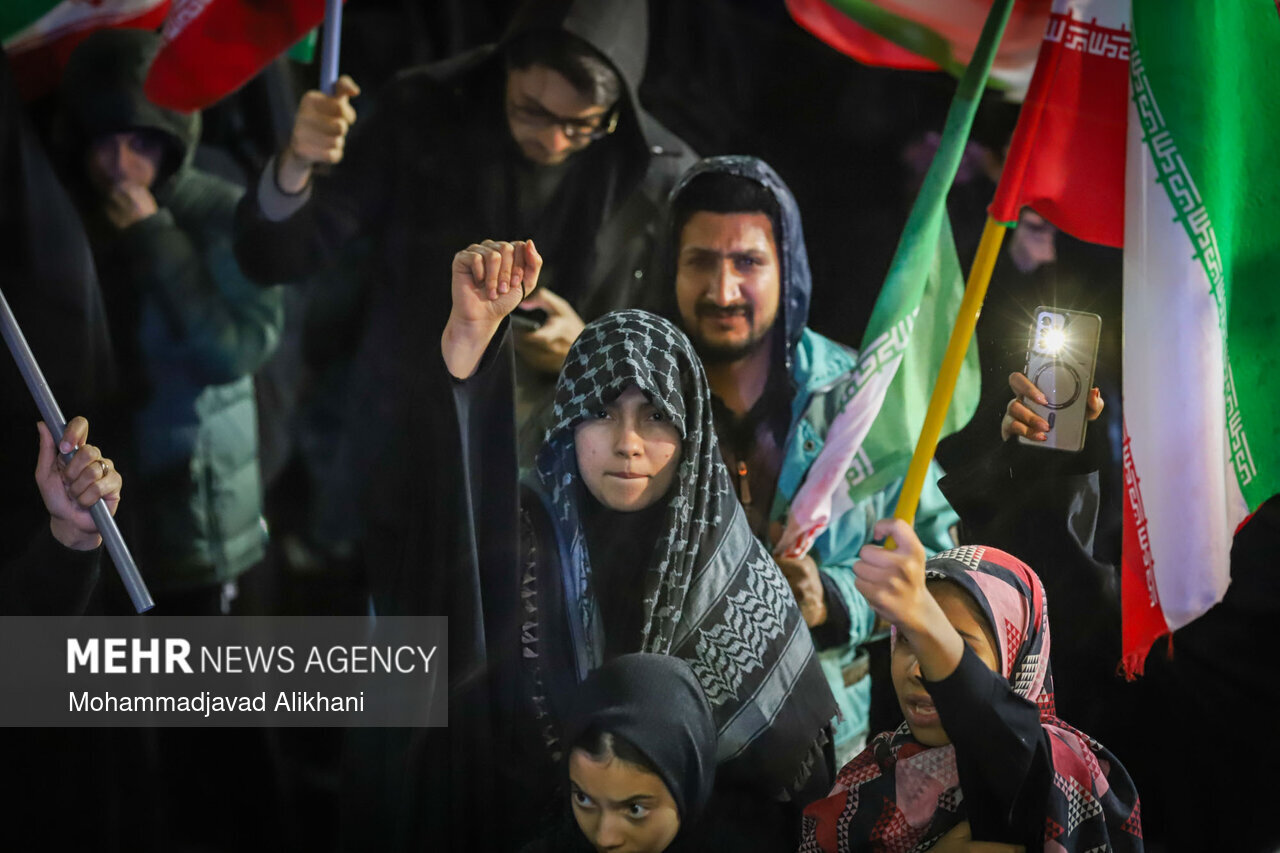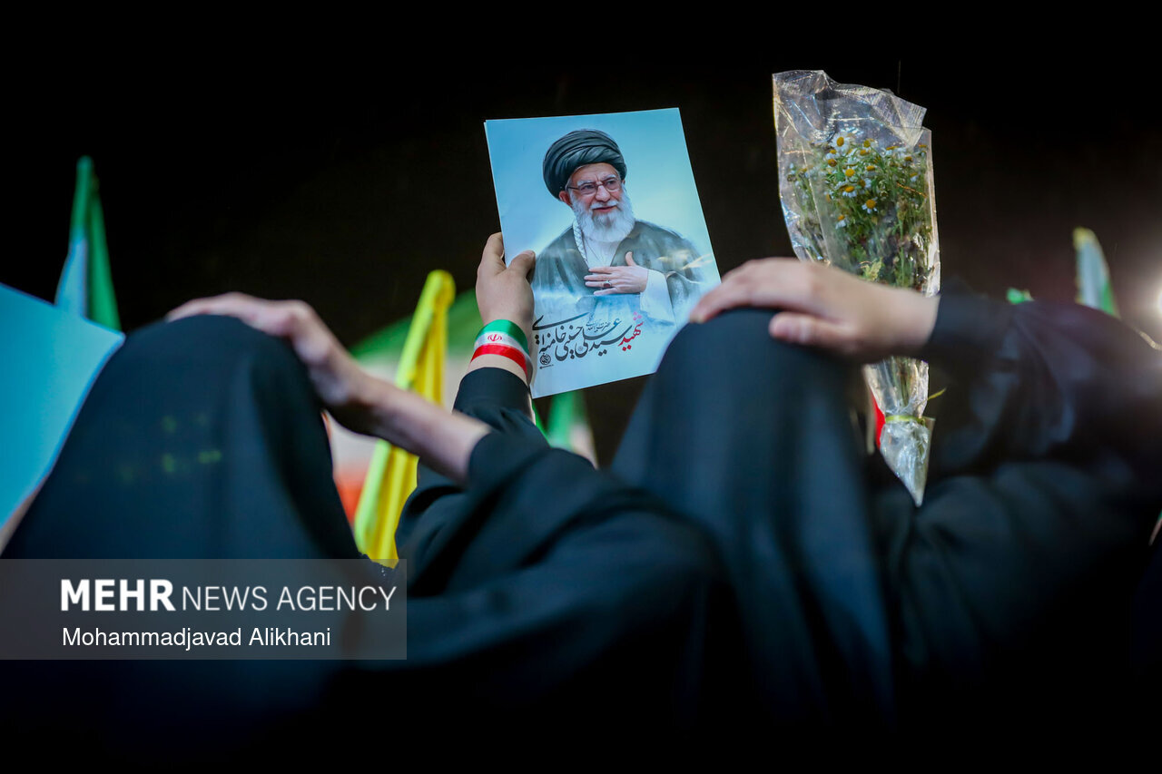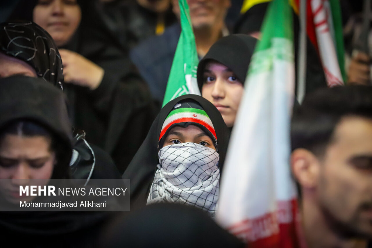 خلال حرب رمضان، ولإحباط مؤامرةٍ محتملةٍ من العدو الصهيوني، تتجمع مئات الآلاف من الشعب الايراني في ساحة الثورة الإسلامية بطهران تضامناً ودعما للقوات المسلحة امام العدو الصهيوالامريكي المجرم.